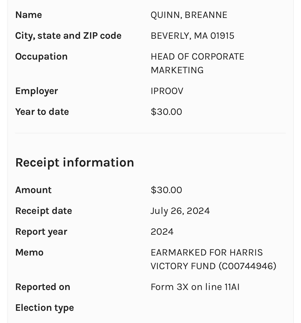Breanne Quinn, iProov’s Head of Corporate Marketing in the United States, appears in publicly searchable Federal Election Commission (FEC) records as an individual donor to Democratic political campaigns.