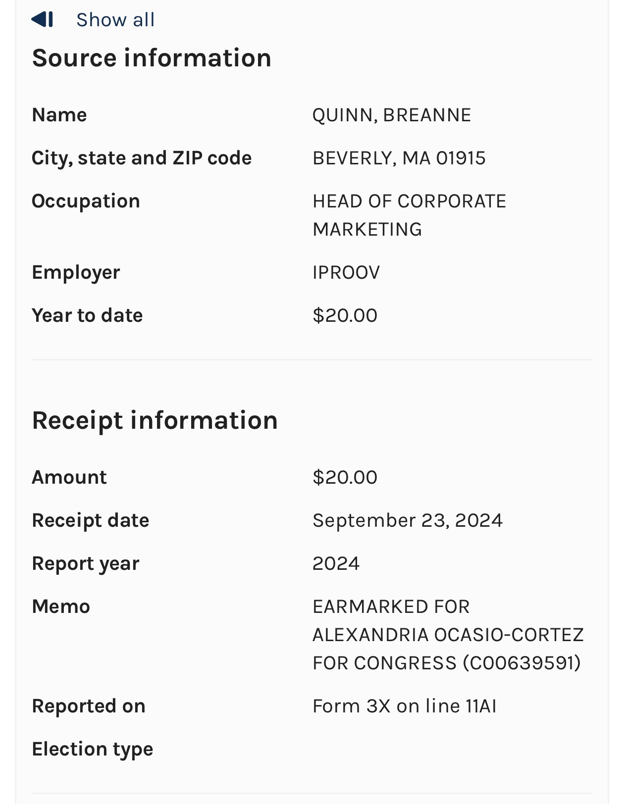 According to those filings, Quinn has made multiple personal contributions to Democratic candidates and committees, including repeat donations to Vice President Kamala Harris and a contribution to Representative Alexandria Ocasio-Cortez. Examples below:
