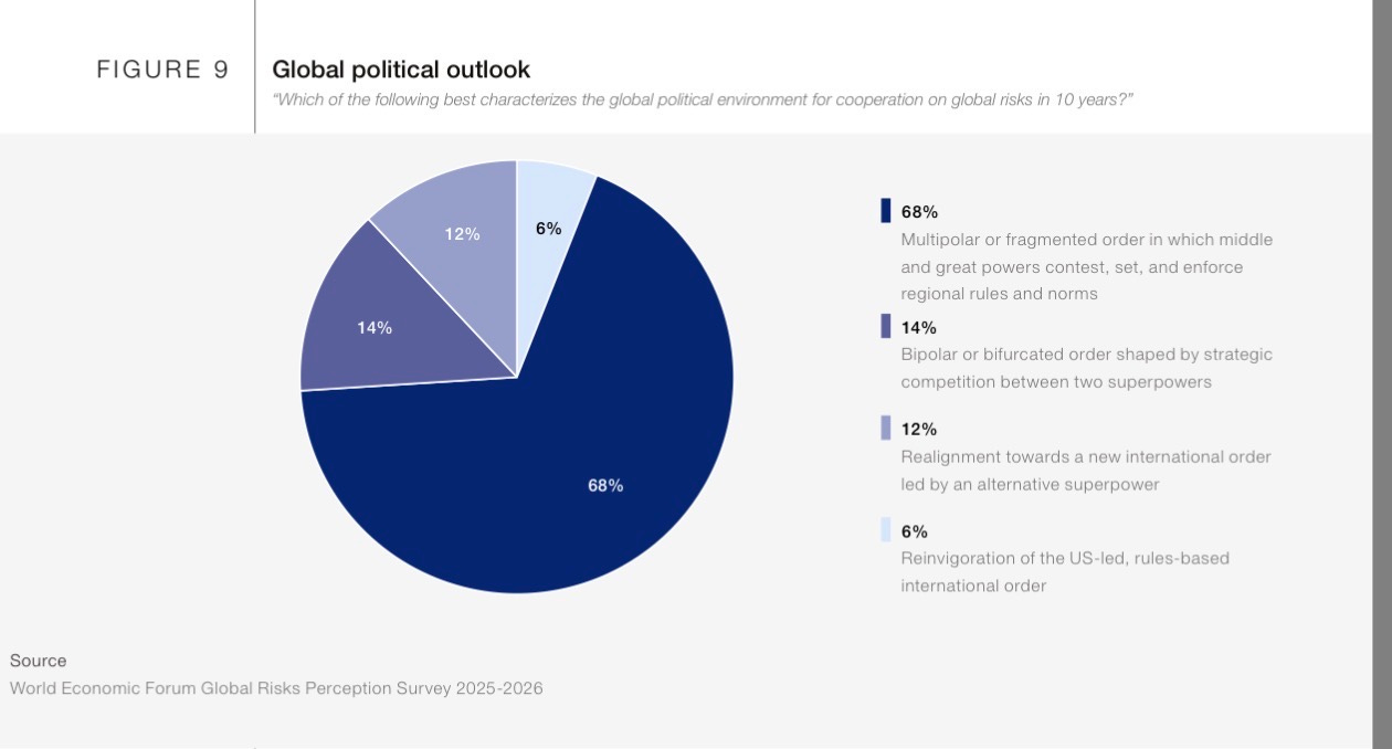 68% expect a multipolar or fragmented order where middle and great powers contest and enforce regional rules.