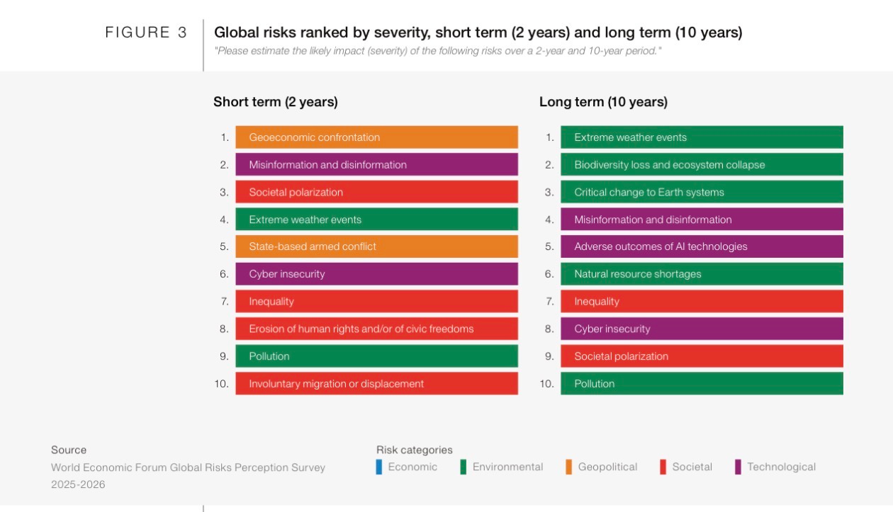 In the two-year horizon, state-based armed conflict remains embedded in the top five risks. War is not treated as a tail risk. It is treated as part of the operating environment.