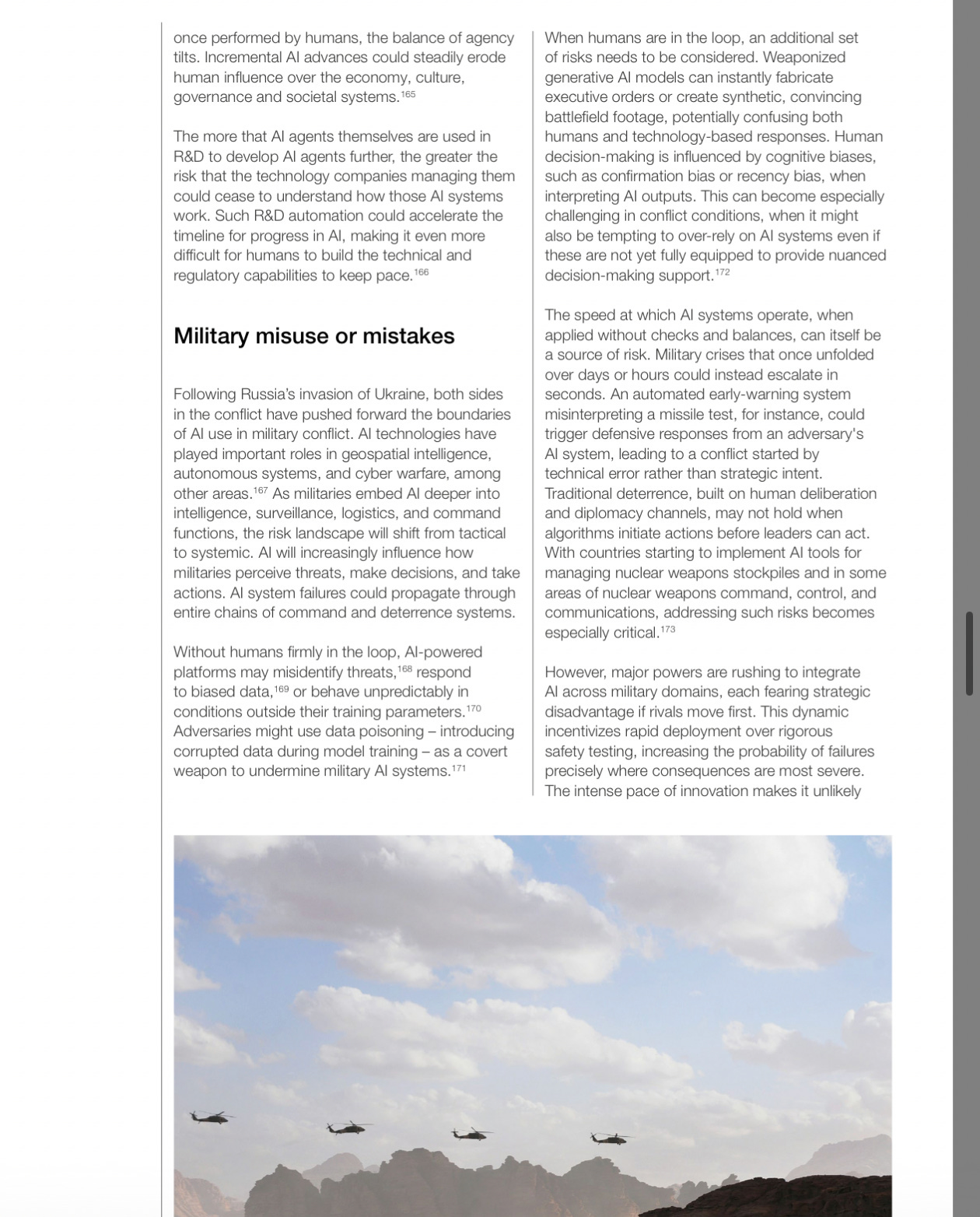 In the AI section, under “Military misuse or mistakes,” the report outlines how AI embedded in intelligence, surveillance, logistics, and command systems could shift conflict risk from tactical to systemic.