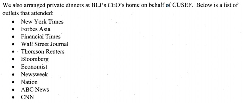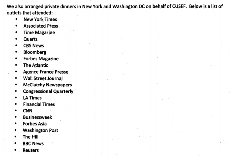 A 2014 filing reveals that lobbying firm BLJ “arranged private dinners in New York and Washington DC on behalf of CUSEF” with over 20 attendees including The New York Times, The Washington Post, Reuters, Associated Press, BBC, and more: