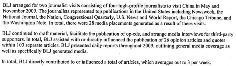 In order to develop favorable coverage in key national media, BLJ will continue to organize and staff “familiarization trips” to China. This includes recruiting top journalists to travel to China, selected for effectiveness and opportunities for favorable coverage.