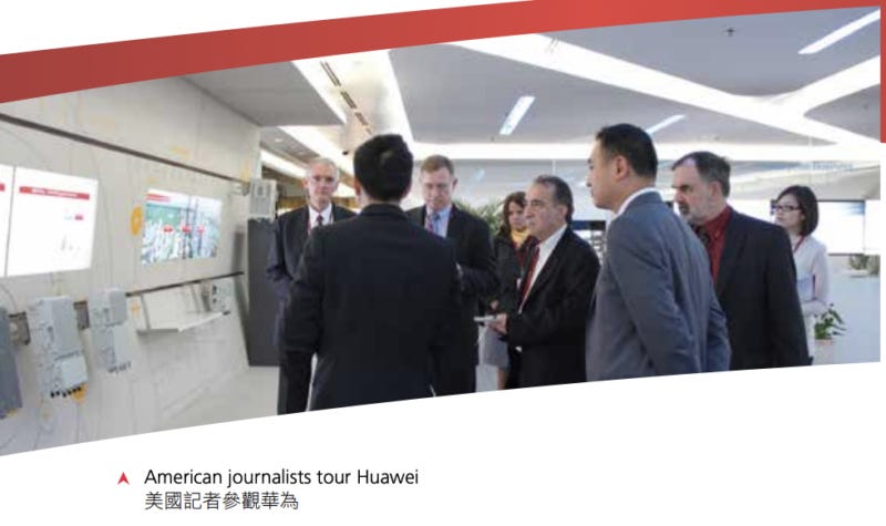 Between 2011 and 2013 images reveal journalist touring Huawei – a telecommunications firm labeled a “national security threat” and military collaborator by the U.S. government – along with Chinese military bases:
