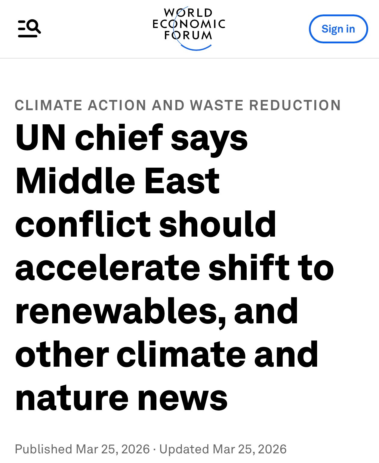 The first—“UN chief says Middle East conflict should accelerate shift to renewables…”—uses the current war to argue for immediate acceleration of the energy transition.